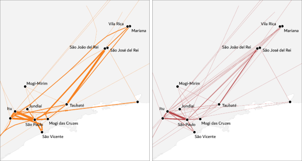 Spatial trajectories of spouses in the second half of the 18th century (1750-1800), based on places of birth and marriage listed in the genealogical records. Although the mobility of spouses kept the same geographic extent, the proportion of long-distance trajectories decreased during the period, favoring short-distance mobility. Connections between urban centers in São Paulo with Mato Grosso and Goiás reveal a large number of “returnees” – people that were born in the mining areas but returned to their parents’ hometowns to marry.